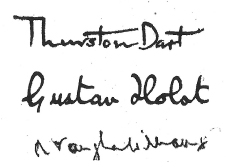 The early Signature Books are hard backed with their front covers engraved in gold leaf. They contain signatures of some musicians who were also eminent in other fields of music. As far as can be ascertained, Ralph Vaughan Williams came only once, but Thurston Dart and Gustav Holst attended on several occasions.