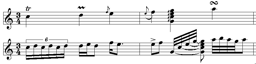 The folowing (unrealistic) example shows all six ornaments in the same order as listed above. The stave below shows approximately how it should be played.